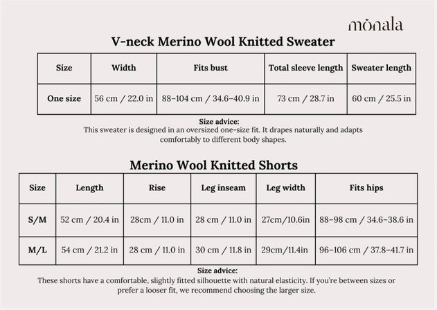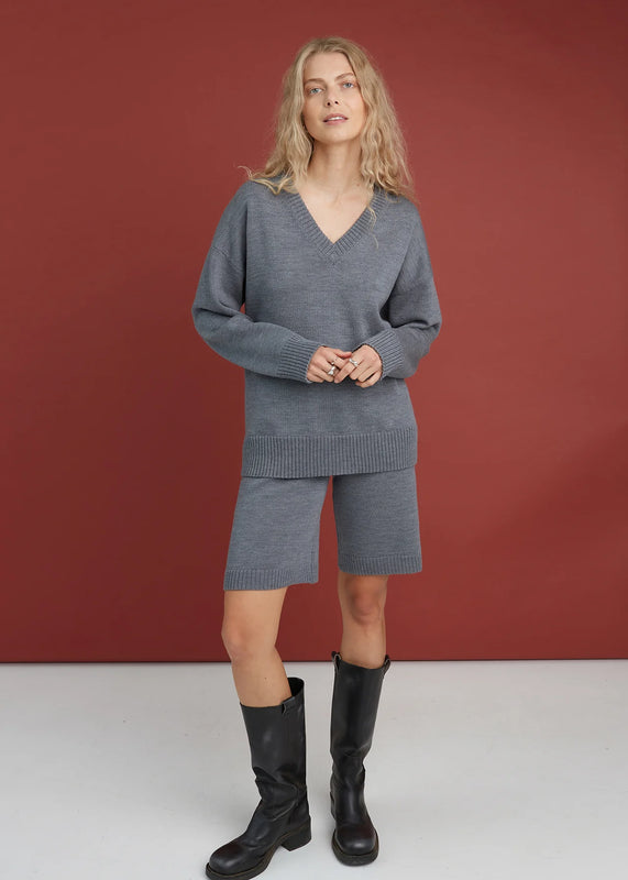 A modern and versatile knitwear set crafted from 100% merino wool. The oversized V-neck sweater features dropped shoulders and ribbed trims, paired with matching shorts designed with a comfortable drawstring waistband and ribbed hems. Soft, breathable, and easy to style, this set offers effortless elegance for everyday wear and slow living moments.