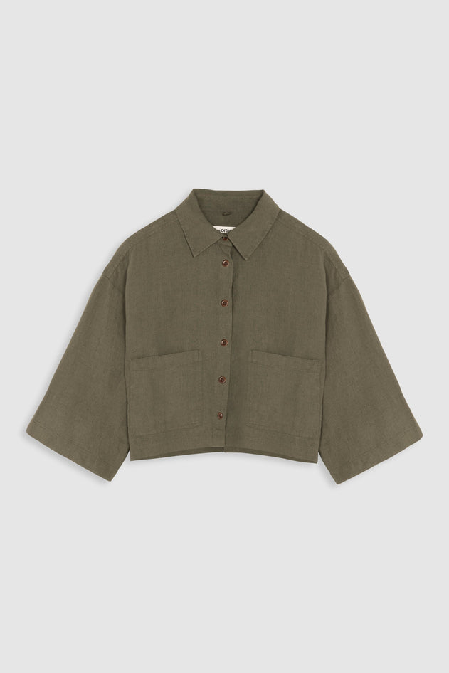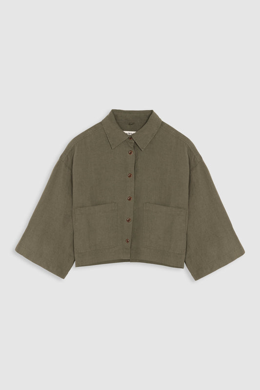 Relaxed fit button-up overshirt with flared, three-quarter sleeves, crafted from 100% linen. This slightly cropped shirt would go really well with a high rise pants or jeans.
