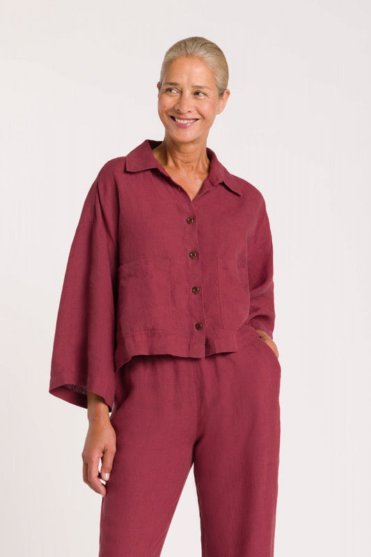 Linen shirt with button closure and wide, slightly cropped sleeves in beautiful dark wine red color.