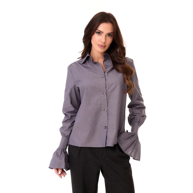 The Carmen Button-up Shirt in Steel Grey combines refined tailoring with understated sophistication. Crafted from premium cotton, this piece delivers exceptional comfort through its breathable, skin-friendly fabric. The distinctive cuffing and decorative shoulder pleats elevate the design, while the slightly relaxed silhouette balances structure with ease of movement. A rounded hem, reinforced yoke, and complementary button detailing complete the construction. The muted steel grey tone pairs effortlessly with both neutral and layered wardrobes, making it an essential transitional piece for discerning minimalists and those who value quality basics.