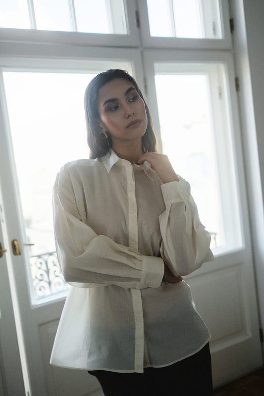 Timeless Parisian shirt. Features a relaxed fit with dropped shoulders, wide pleated sleeves, and adjustable cuffs. The slightly sheer fabric and minimalist design—concealed buttons, straight hem—create an effortlessly elegant look.