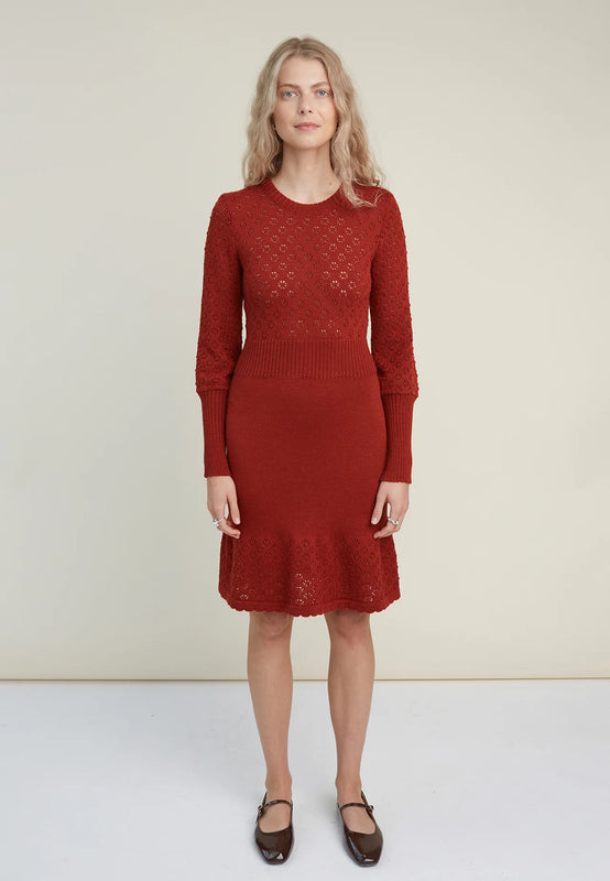 Crafted from ultra-soft merino wool, this elegant lace knit dress is going to win your heart. The dress comes with a fluid A-line knee-length skirt and a subtle lace pattern in the upper part and at the hem, adding a touch of elegance to the entire look. The wavy hemline and cuffs make this dress even more girly, but that does not mean that this dress is just all about it. Pair this lace knit dress with edgy boots and other funky pieces to reveal your personality and style. The dress is easy to style regardless of the occasion.
