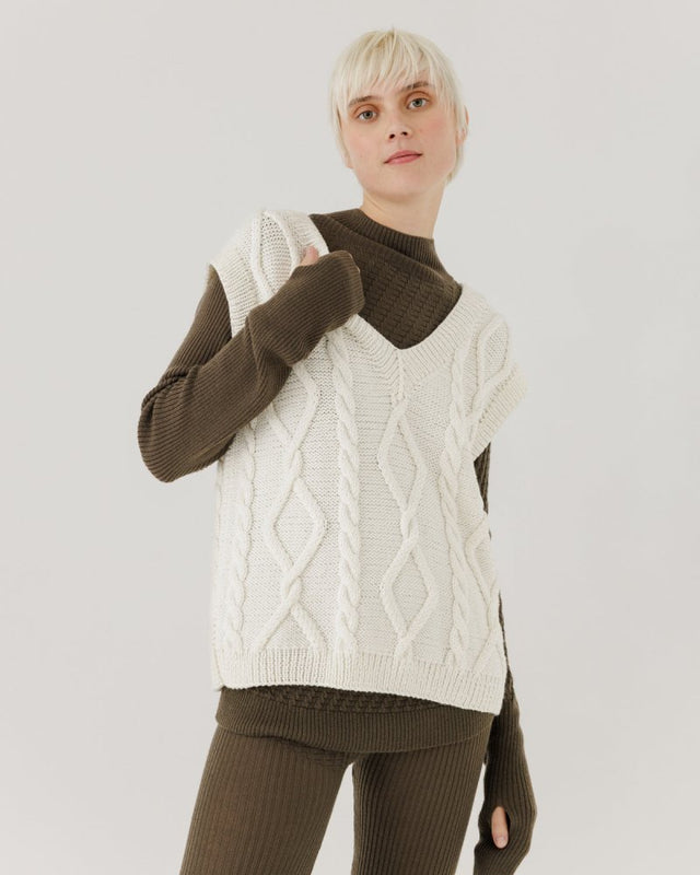 "Laimė" means "luck" in Lithuanian. The vest's cable was inspired by our Baltic roots and pagan symbols that our ancestors believed to bring good fortune. Her seriously soft yarn could have been spun by Baltic faeries (using their fav merino wool yarn) and her oversized fit is perfect for seasonless layering. Soft to the touch and wrinkle-resistant, look closely to spot her subtle, traditional Lithuanian patterns, spinning folk stories of mythical animals and nature. Runs true to size. Recommended to take your normal size. It takes 17 hours, almost four full working days, to handcraft the Laimė from start to finish.