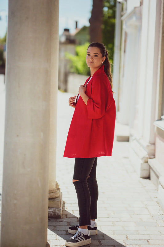 Nola linen kimono jacket is a minimalist, loose-fitting kimono-style jacket. The jacket comes with a belt. The linen kimono jacket can be ordered in all the shades of the Jade linen dress.