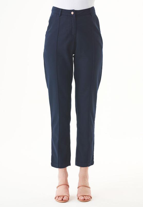Women's lyocell and organic cotton blend trousers with fake back pockets.