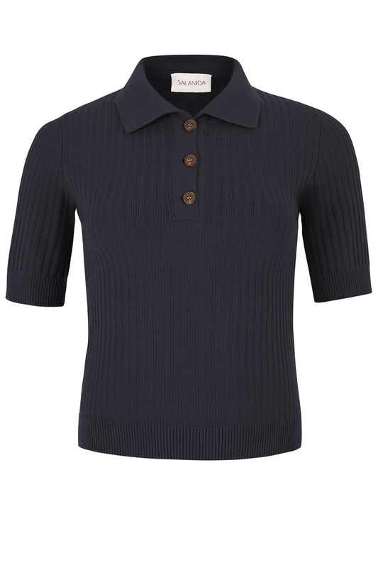 The Madonna polo top is designed in a refined rib structure featuring short sleeves and a sleek polo collar with buttons. This knit short-sleeved top is a versatile piece you can wear solo, layer effortlessly, or pair with Salanida's Vera pants or Madonna skirt for a chic co-ord look.