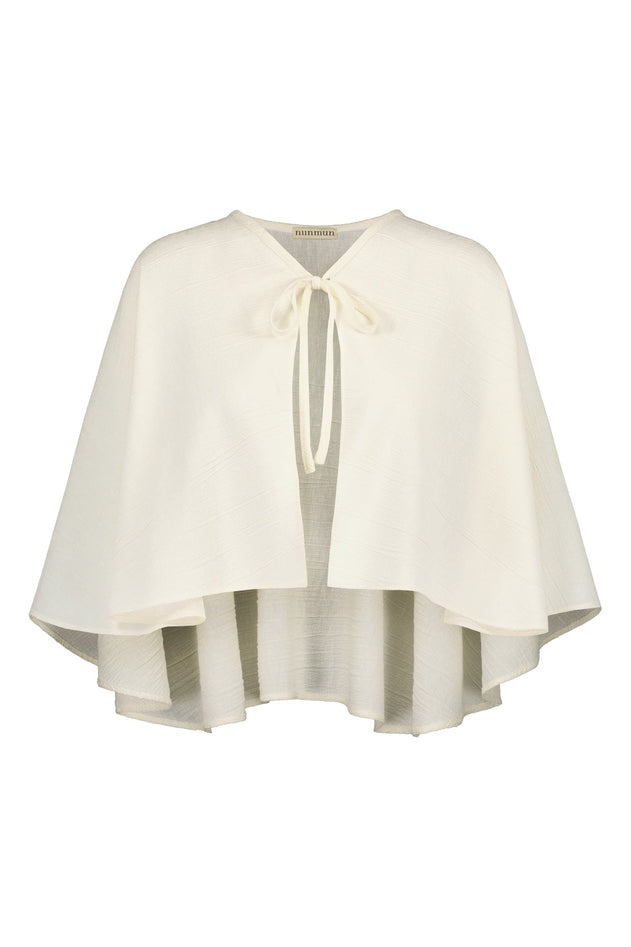 The Maggholm cape is new brilliant product, admired for its versatility. Wear it over sleeveless dresses and tops to cover your shoulders. The cape also adds a layered look to your outfits. Made from a beautiful hemp-silk blend, this fabric is an upcycled fashion material. The surface of the fabric resembles the rippling surface of water. Wonderfully lightweight, structured, and beautifully draping, it is suitable for both formal occasions and everyday wear.
