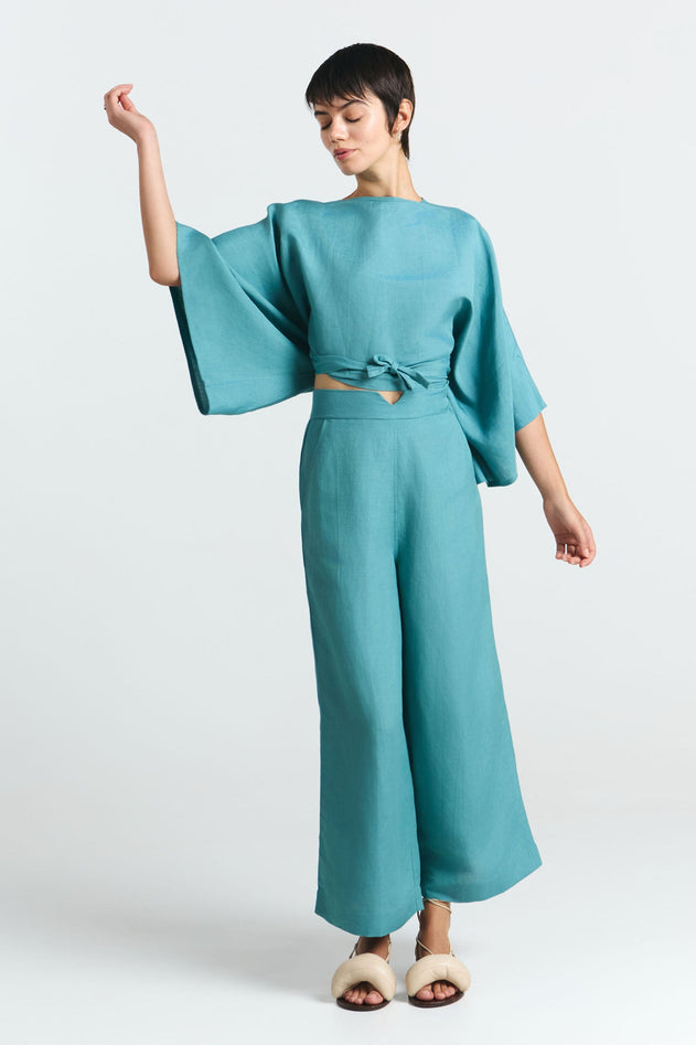 High waisted linen blend culotte pants with a wide-leg design. Featuring pockets, elastic on the back of the waist and a hidden zipper on the side.