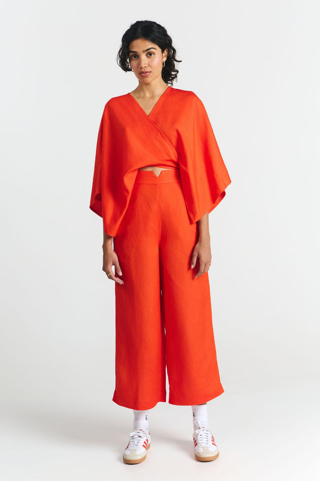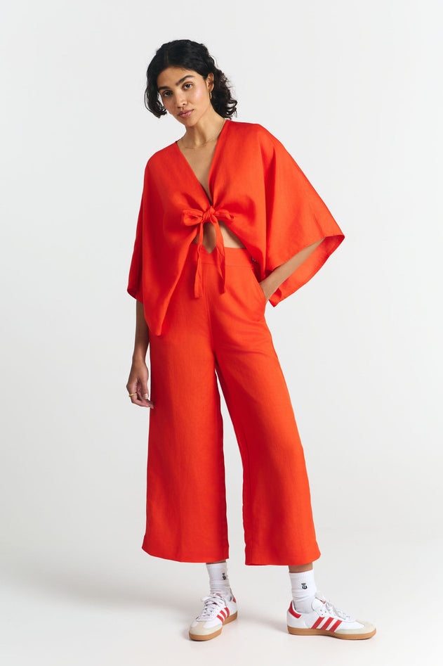 High waisted linen blend culotte pants with a wide-leg design. Featuring pockets, elastic on the back of the waist and a hidden zipper on the side.