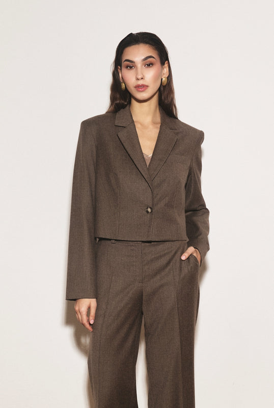 A minimalist blazer crafted from fine wool with clean lines and a single-button closure. The relaxed fit and rollable sleeves offer effortless styling versatility. Perfect as a capsule wardrobe staple or layered with contrasting pieces.
