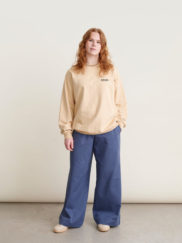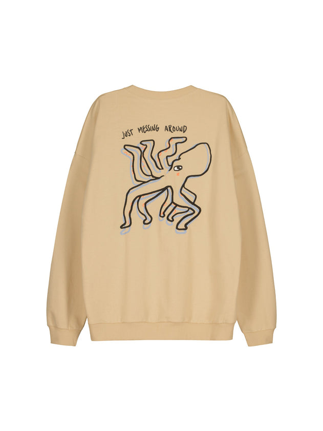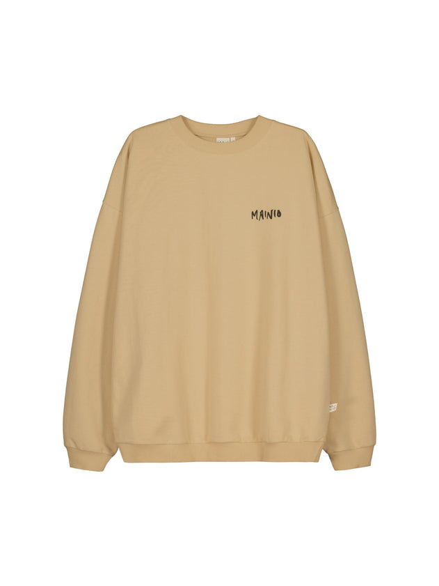 This Messing Around Sweatshirt in beige offers a relaxed, unisex fit designed for comfort and style. Featuring the distinctive Messing Around print on the back and the Mainio print on the front, it combines unique graphics with quality craftsmanship. Made from 100% organic cotton and certified by GOTS, this sweatshirt ensures sustainability without compromising softness or durability. The double size option corresponds to the larger size, providing a versatile fit for various body types. Ideal for those seeking eco-friendly fashion with a casual, expert touch.