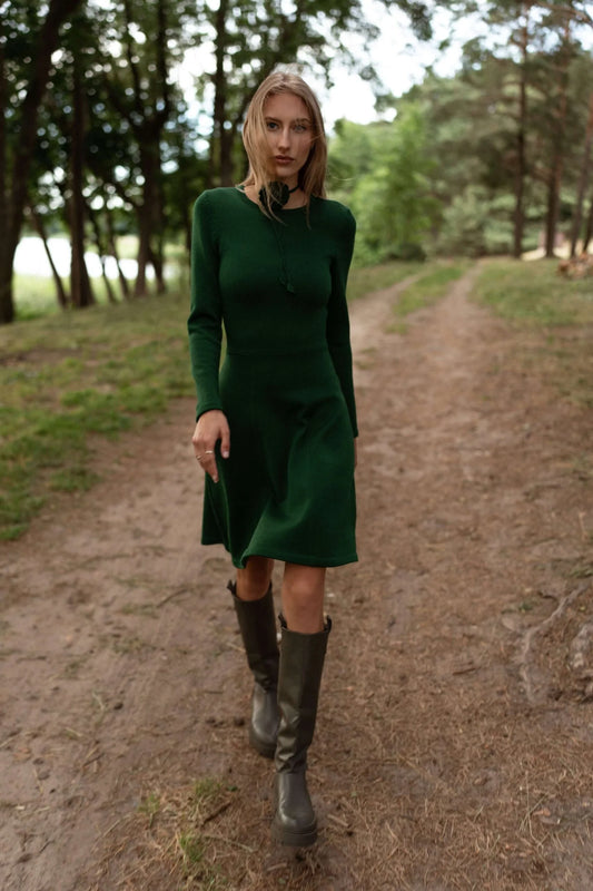 Timeless elegance meets sustainable craftsmanship in our Mini A-Line Dress. Knitted from 100% responsibly sourced merino wool, this piece combines softness and breathability with a flattering silhouette that moves beautifully with you. The crew neck and long sleeves create a refined silhouette, while the graceful A-line cut works seamlessly from day to evening.