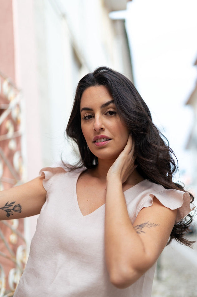 The Sofia Top is a light and elegant choice. Beautifully gathered ruffle sleeves add a playful touch, balanced by the classic V-neckline for a calming effect. The top is of regular length, featuring small side slits at the hips for added detail.