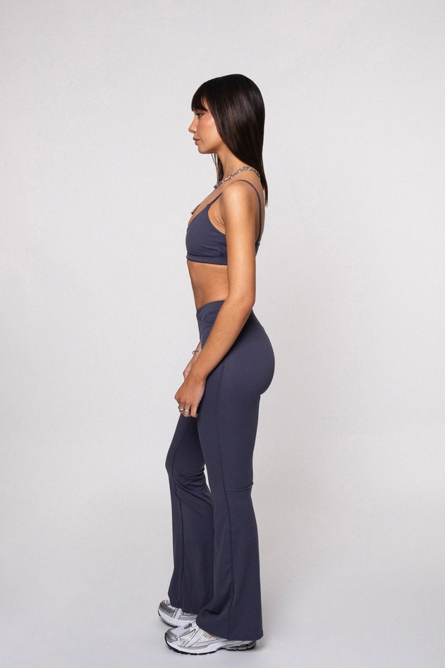 Navy blue sports bra with thin spaghetti straps and a deep rounded neckline. Removable cups with medium support, perfect for low-impact activities like pilates or yoga.