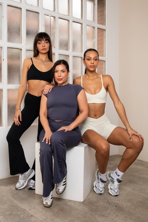 Black flared leggings with a crossover waistband that stylizes the figure and provides a comfortable fit. Perfect for low-impact activities like pilates, yoga, or gym workouts.