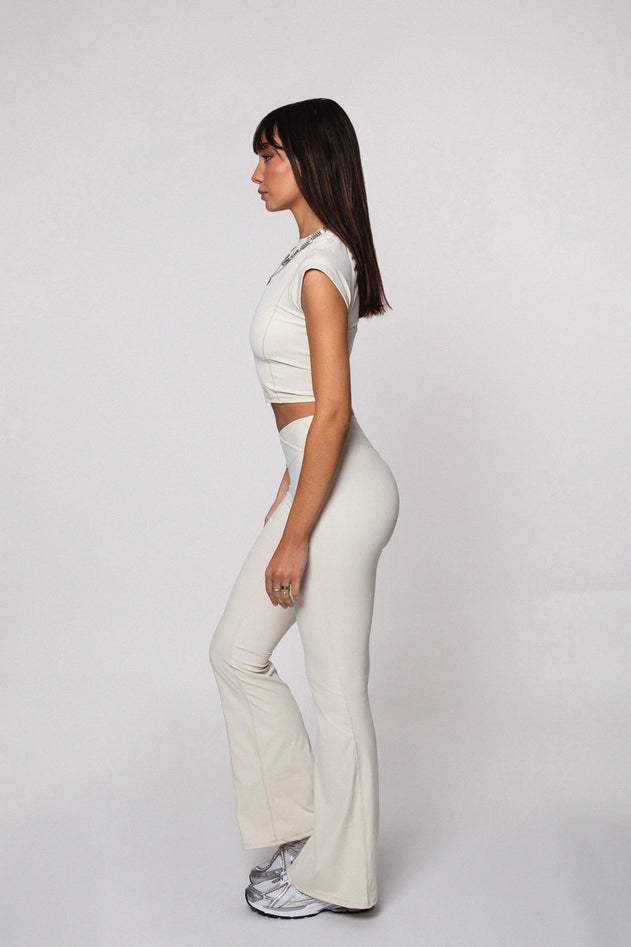 White flared leggings with a crossover waistband that stylizes the figure and provides a comfortable fit. Perfect for low-impact activities like pilates, yoga, or gym workouts.