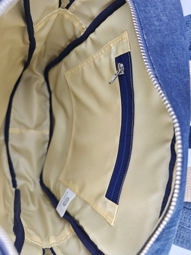 The KAARINA backpack in denim blends rugged recycled fabric with fresh beige accents for a unique everyday look. It features a secure zippered pocket inside, a handy flap pocket outside, and adjustable padded straps with snap-fastening handles for all-day comfort and versatility.