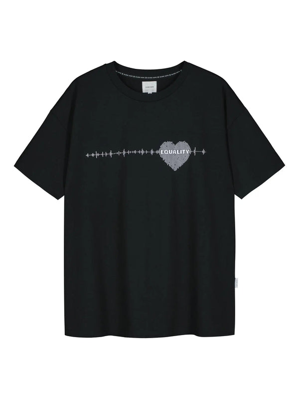 Heart print and "equality" text: The black shirt is decorated with a heart print and the text "equality", which make it a strong statement for equality.
