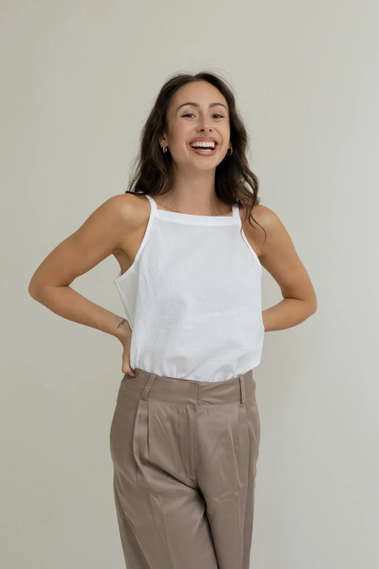 This lightweight top made from organic cotton is very light and comfortable on the skin. The top is made of seersucker and has a light texture. It gives you a light, summery look and is an absolute must-have for every wardrobe. With this sleeveless white cotton top, you have the perfect piece for your capsule wardrobe.
