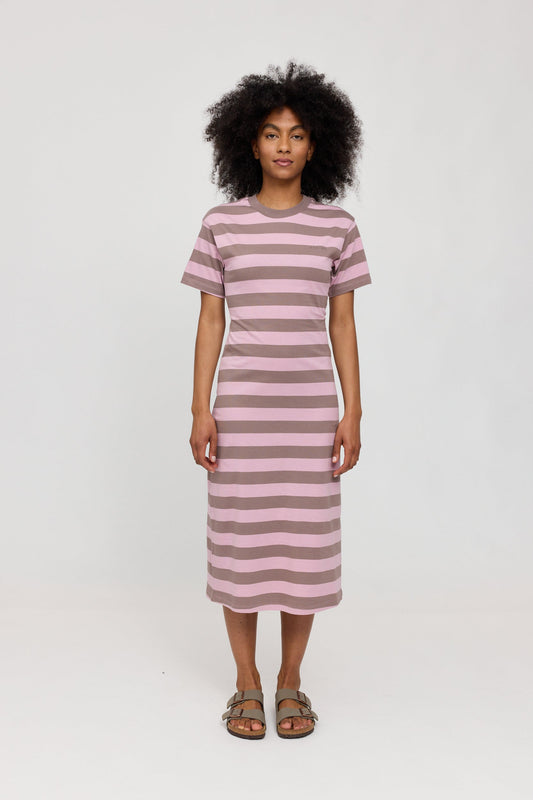 The Midi Block Stripes Dress by Mazine features a modern, simple design. Made from 100% GOTS-certified organic cotton, it’s comfortable and perfect for everyday wear. The heavyweight single jersey ensures a great fit and shape retention. With its regular fit, round neckline, and striped print, this dress adds a dynamic touch, finished with a subtle logo print at the hem.