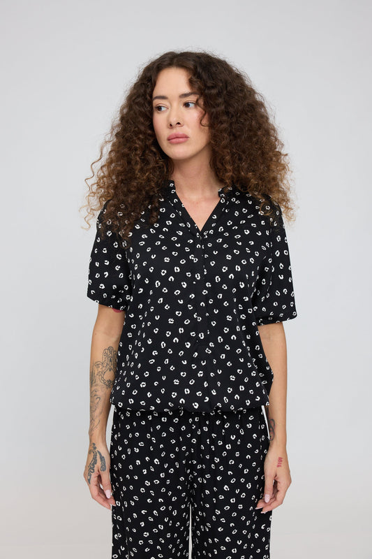 The Printed V-Neck Blouse by Mazine is a stylish, modern choice. Made from high-quality ECOVERO™ viscose, it feels soft and comfortable. The feminine V-neck, hidden button placket, and elastic hem create a chic, cropped look. The all-over print adds a fresh accent, making it a standout piece.
