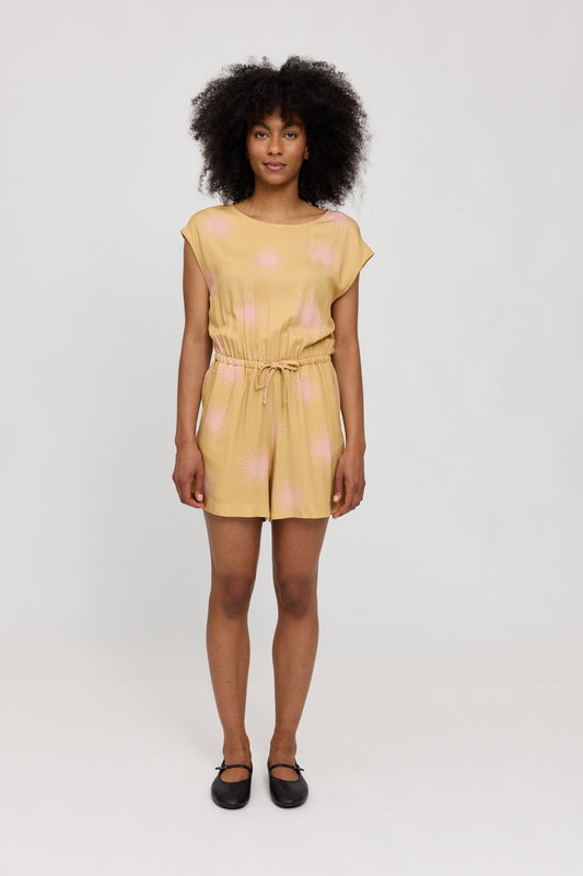 This sleeveless short printed jumpsuit by Mazine combines lightness and style. Made from high-quality ECOVERO™ viscose, it offers a soft, flowing silhouette. The regular fit, all-over print, and self-tie waist create a fashionable look, while side pockets add practical comfort.