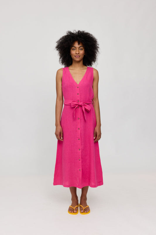 Enhance your summer wardrobe with Sleeveless Linen Maxi Dress. The regular fit flatters your figure while the v-neck adds a touch of sophistication. The vegan horn button closure is both stylish and ethical. Perfect for any occasions, this dress is a must-have for the season.