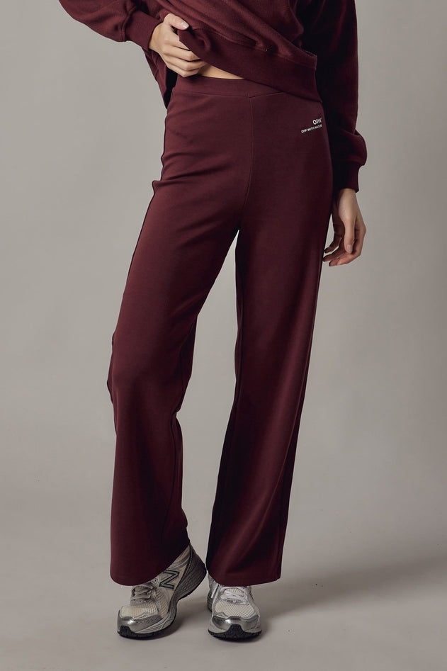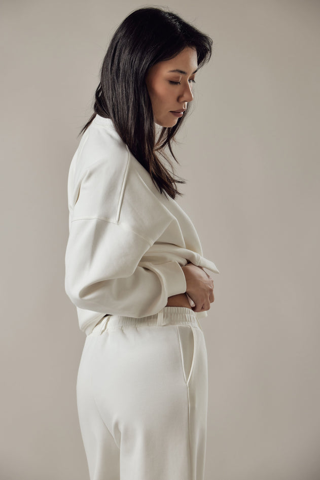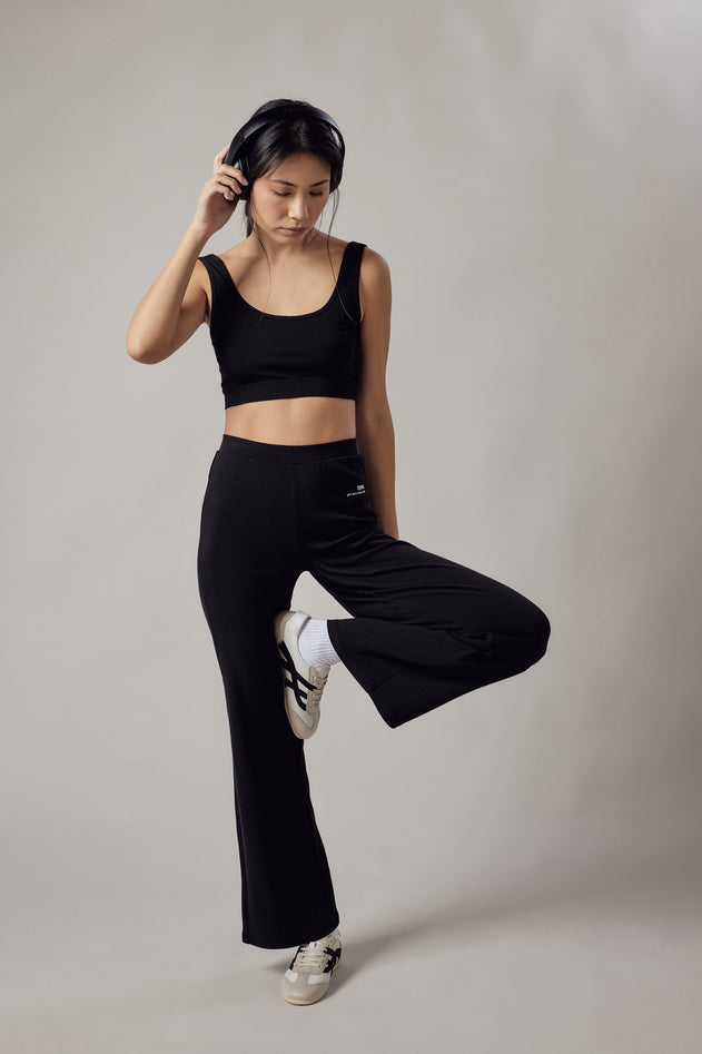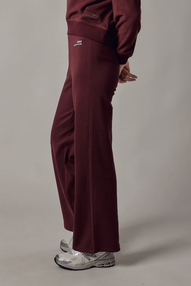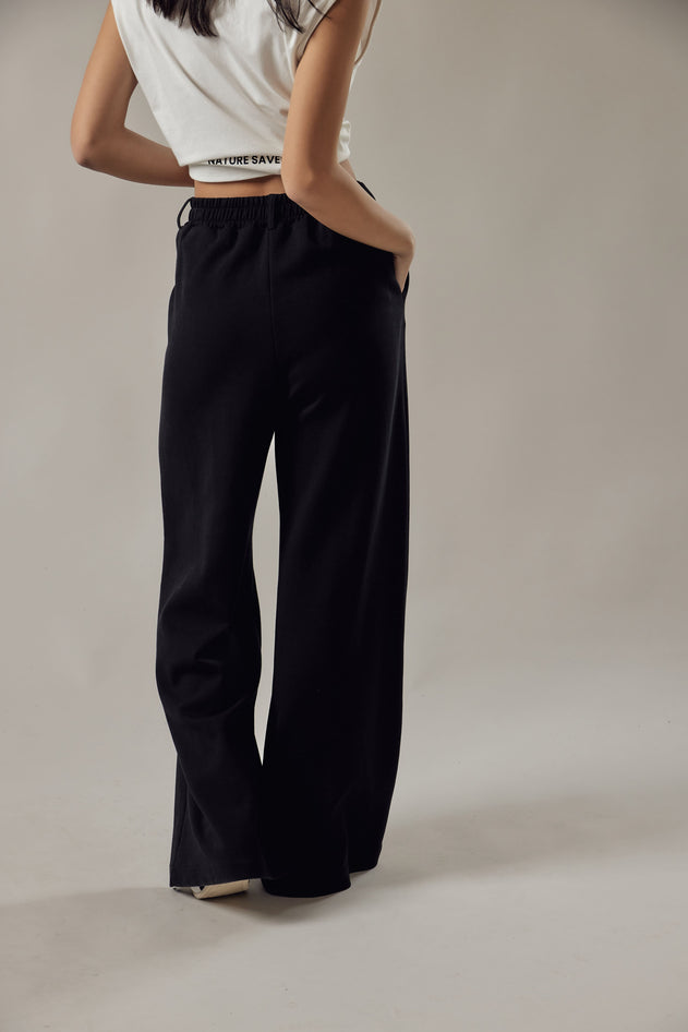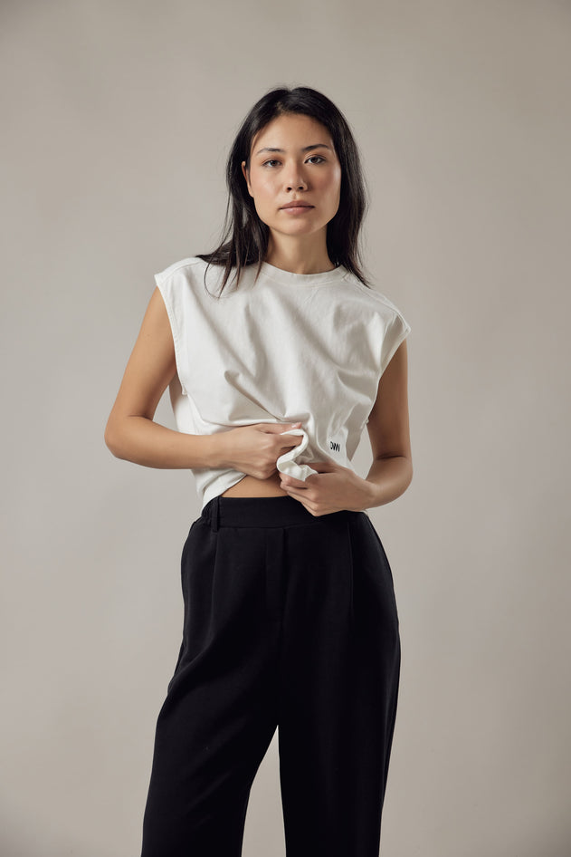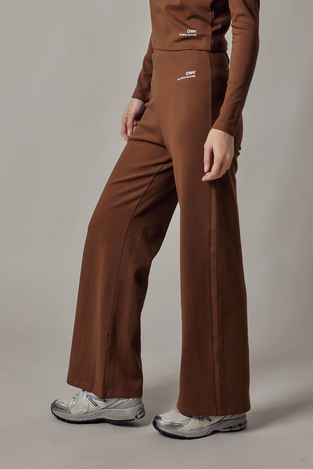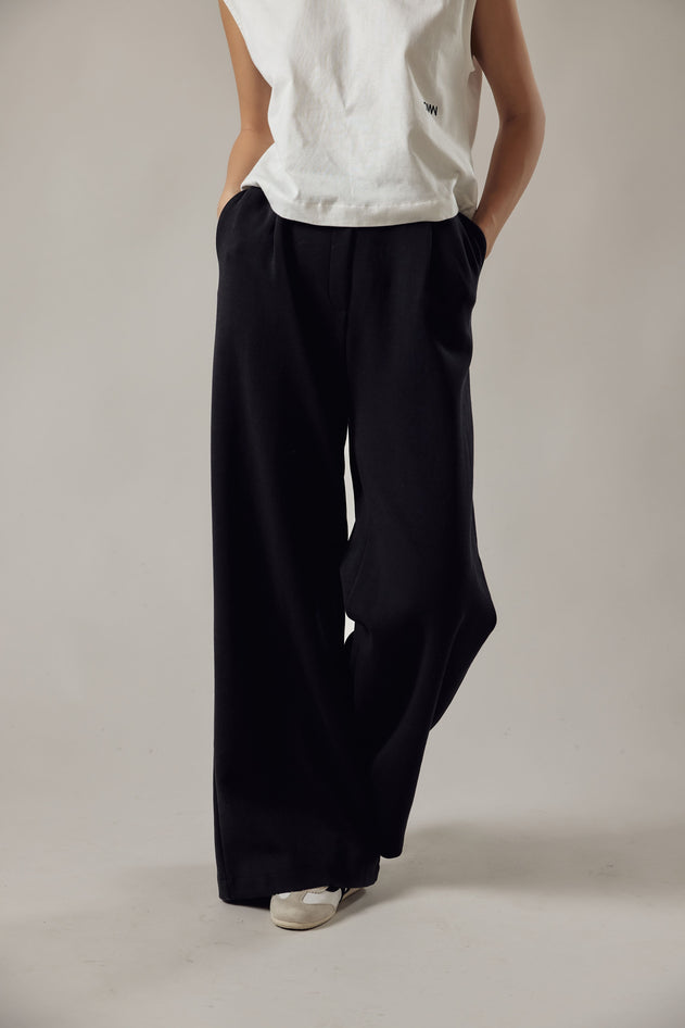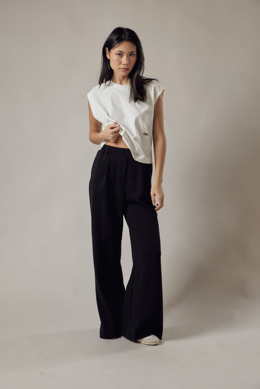 Women's palazzo pants with pleats and belt loops. Featuring an elasticated waist and side pockets. Made of organic cotton and recycled polyester.