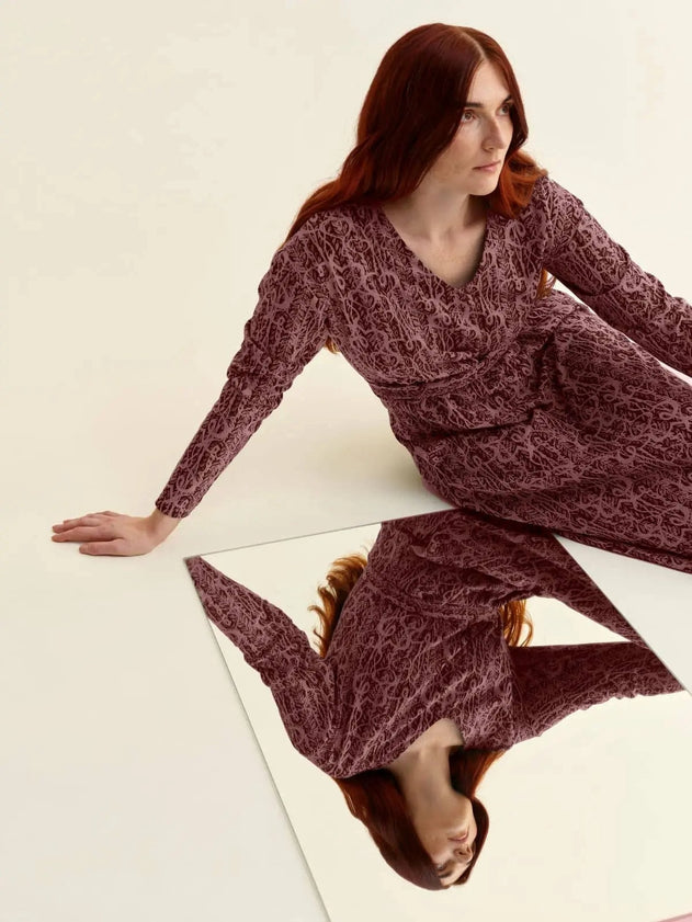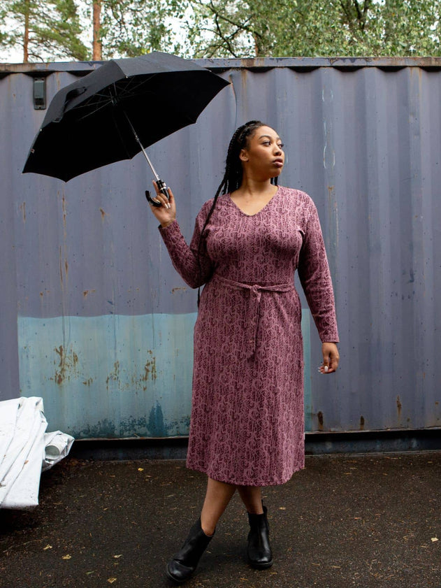 Simuna will charm you with its elegant pink print, which creates a stunning combination with the dark base colour of the dress and instantly puts it at the top of your favourites list. The long sleeves will keep you warm and comfortable even in cooler weather, while the waist-hugging belt creates a feminine and flattering silhouette. The dress extends down to the calf, making it the perfect choice for a variety of occasions.