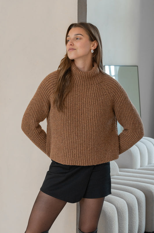 The STORY OF MINE Turtleneck Sweater in the colour brown is designed using a blend of recycled materials, including 60 % recycled wool. As a result, the material contains various colour pigments, and the sweater is extremely soft, providing exceptional warmth.