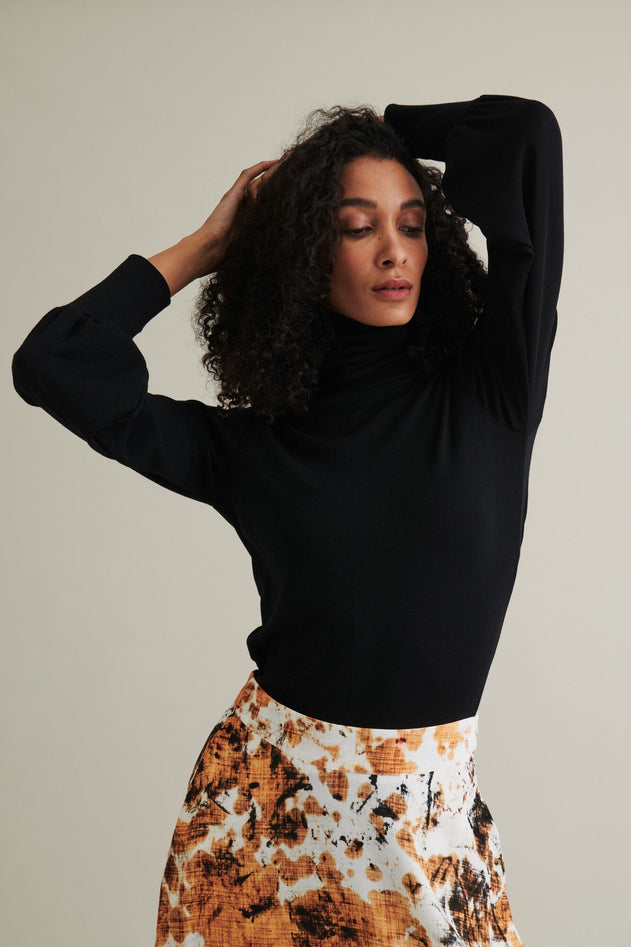 Beautiful polo shirt with puff sleeves made of soft merino wool-silk knit. The wide cuff beautifully finishes the puff sleeve. The polo shirt is timeless and stylish, slightly tailored, and fits beautifully. The polo collar is high, which can be folded or left casually upright. The polo collar is designed so that it does not constrict the throat.