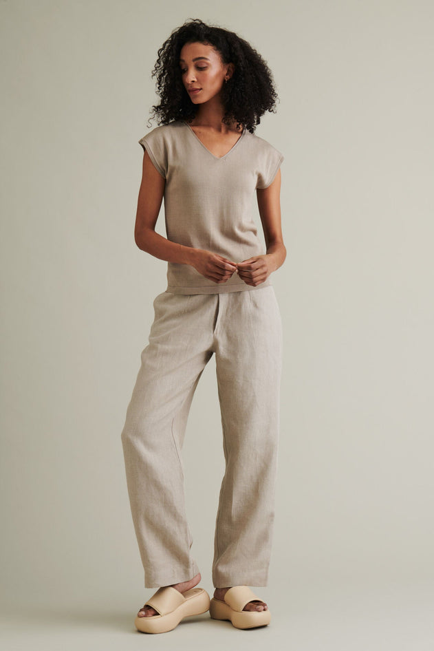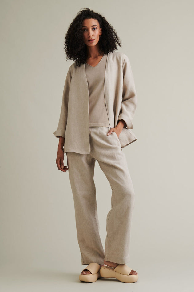 Heisala trousers are neat and relaxed straight-leg trousers that are suitable for both casual and more formal wear. Hemp as a material feels pleasant and breathable. Hemp is slightly thicker and more durable than linen. The trousers feature full-length legs and a high waist. There's a zipper and button closure at the front waist, with an elastic waistband at the back.