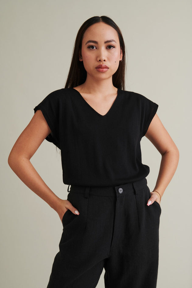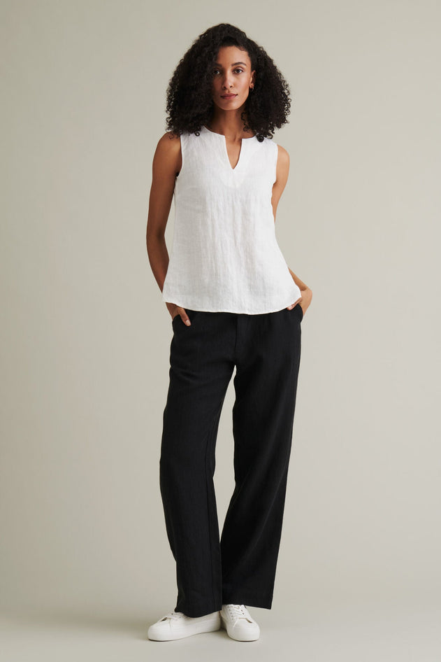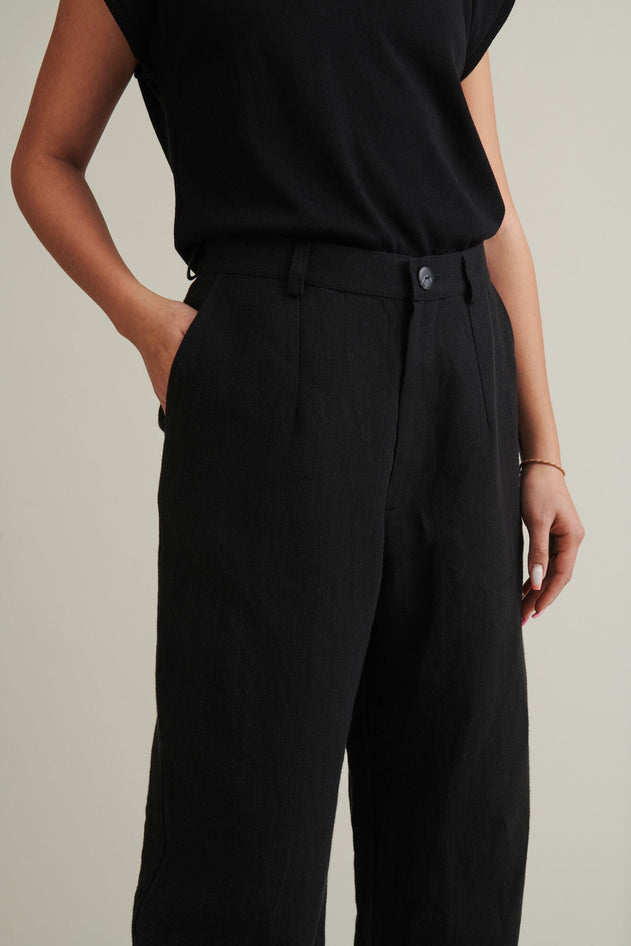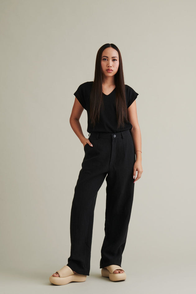 Heisala trousers are neat and relaxed straight-leg trousers that are suitable for both casual and more formal wear. Hemp as a material feels pleasant and breathable. Hemp is slightly thicker and more durable than linen. The trousers feature full-length legs and a high waist. There's a zipper and button closure at the front waist, with an elastic waistband at the back.
