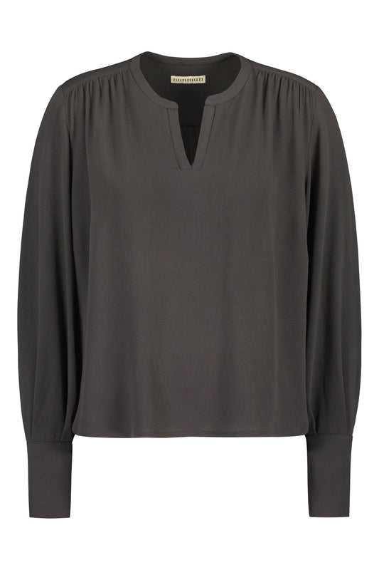 A classically beautiful Sellmo blouse in a renewed model. The material is 100% ecovero, which falls beautifully. A feminine and simple blouse for everyday wear and parties. Beautiful details on the sleeve include a long cuff with a button. The hem is slightly rounded and there is a slit on the side. A beautiful gather on the shoulder, which allows the blouse to fall beautifully and give it a loose fit. The slit and hem at the neckline give a finished look.
