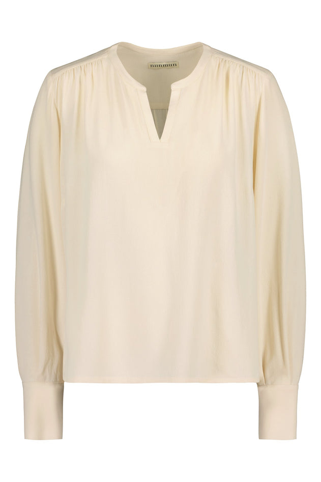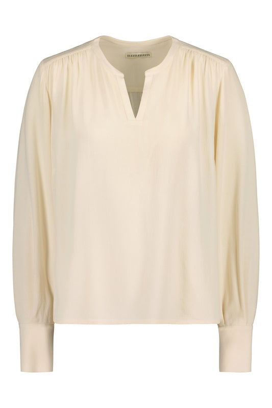 A classically beautiful Sellmo blouse in a renewed model. The material is 100% ecovero, which falls beautifully. A feminine and simple blouse for everyday wear and parties. Beautiful details on the sleeve include a long cuff with a button. The hem is slightly rounded and there is a slit on the side. A beautiful gather on the shoulder, which allows the blouse to fall beautifully and give it a loose fit. The slit and hem at the neckline give a finished look.