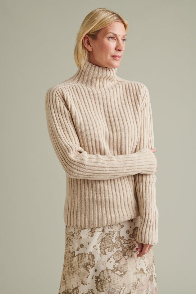Utö wool sweater is a modern version of traditional archipelago knitwear. The delightful detail of the sweater is the shoulder line, which continues from the sleeve straight to the stand-up collar. The stand-up collar is 8cm tall. The fit is straight, and the length is ideal, avoiding widening at the hips. There are no separate ribbed cuffs or hem. The sleeve is intentionally long; by rolling up the sleeve, you add structure to the sweater while the long sleeve provides warmth.