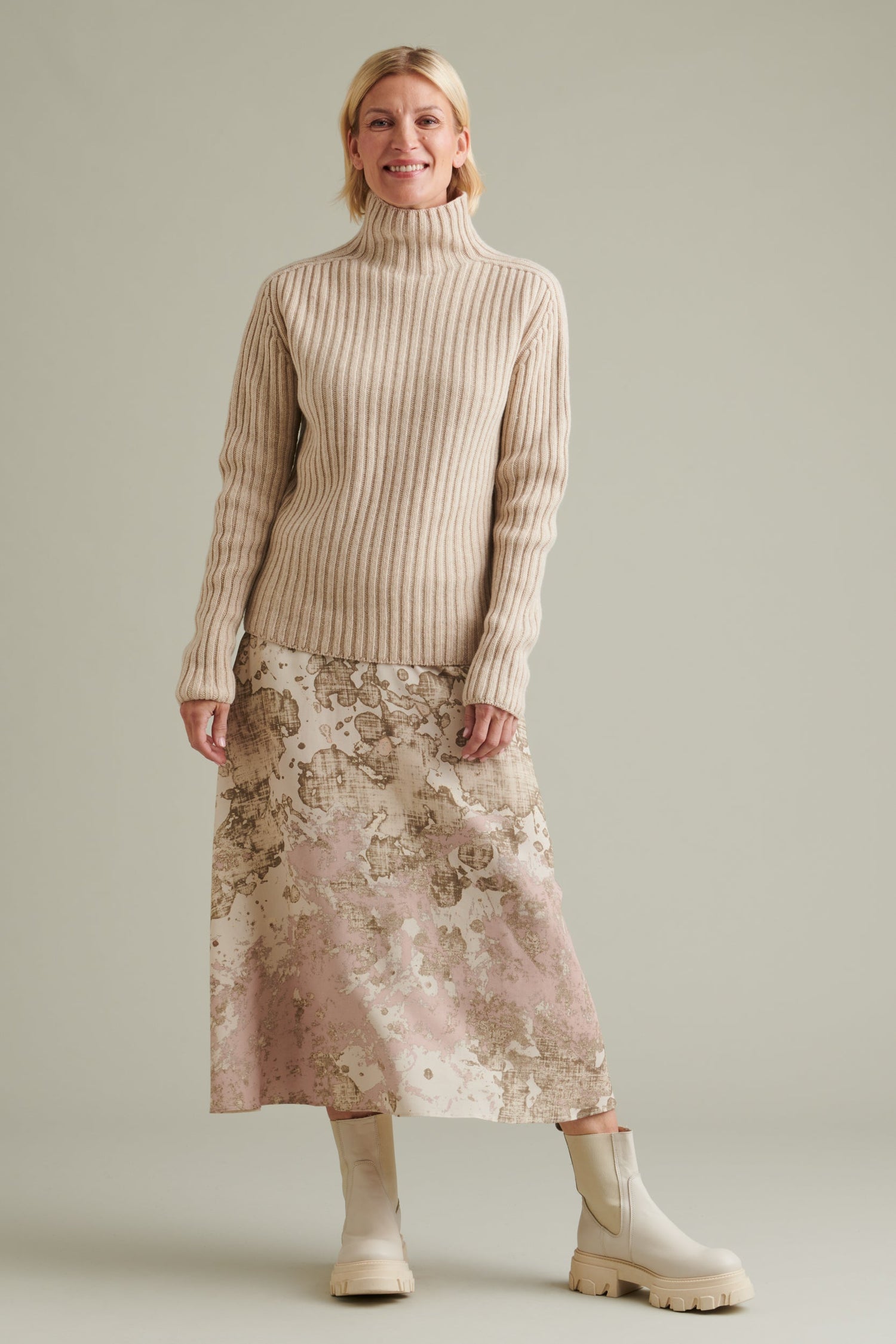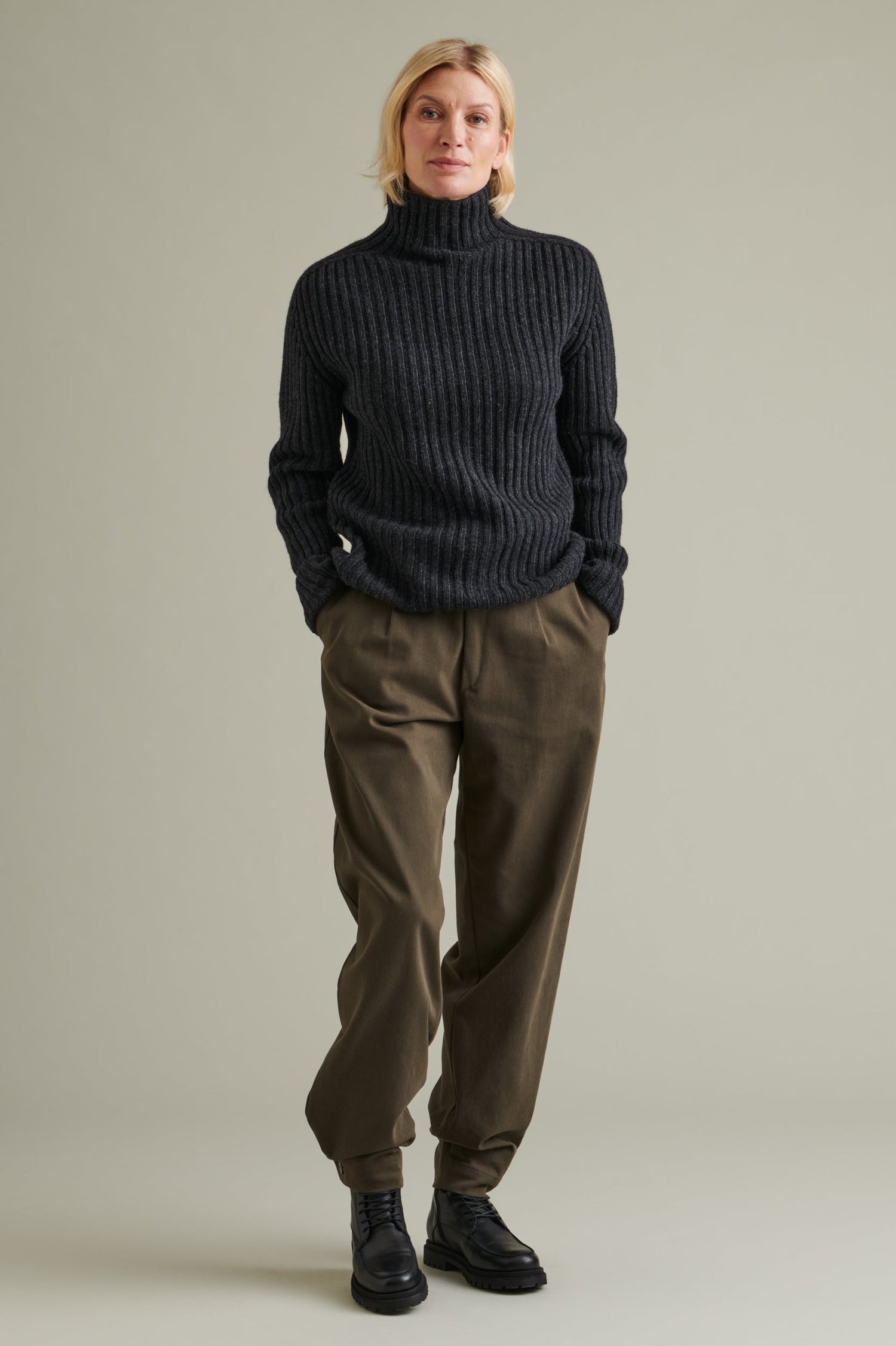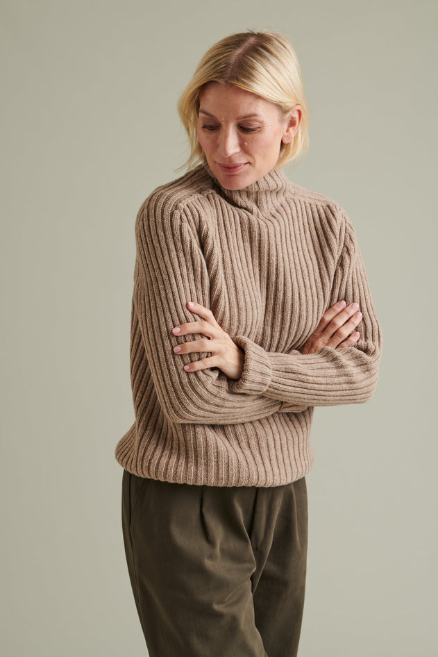 Utö wool sweater is a modern version of traditional archipelago knitwear. The delightful detail of the sweater is the shoulder line, which continues from the sleeve straight to the stand-up collar. The stand-up collar is 8cm tall. The fit is straight, and the length is ideal, avoiding widening at the hips. There are no separate ribbed cuffs or hem. The sleeve is intentionally long; by rolling up the sleeve, you add structure to the sweater while the long sleeve provides warmth.
