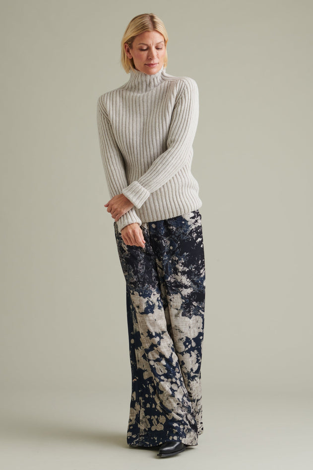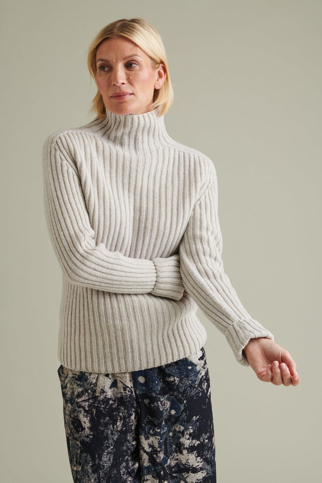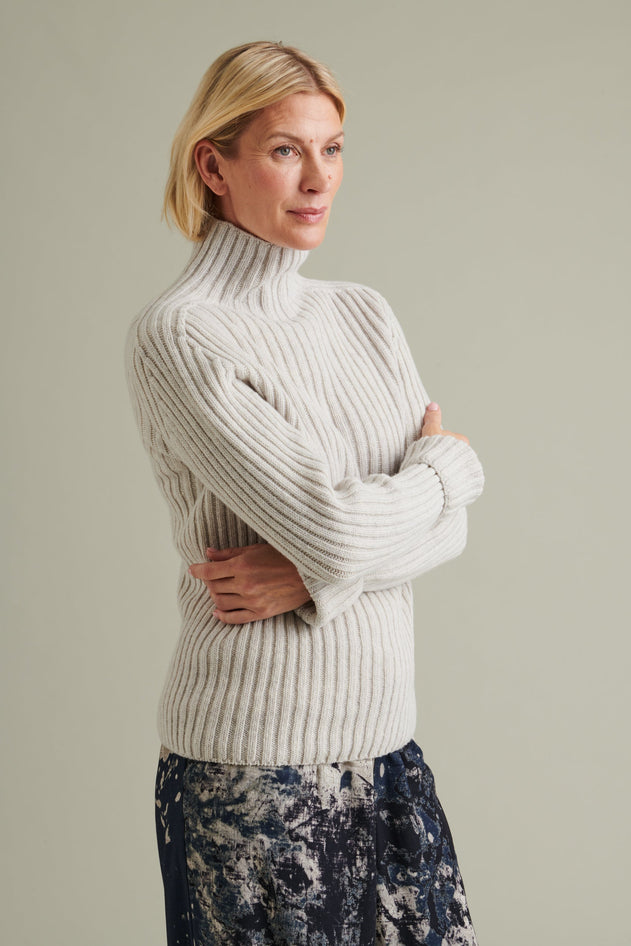 The Utö wool sweater is a modern version of the traditional archipelago knitwear. A delightful detail of the sweater is the shoulder line, which continues from the sleeve straight to the stand-up collar. The stand-up collar is 8cm tall. The fit is straight, and the length is ideal, avoiding widening at the hips. There are no separate ribbed cuffs or hem. The sleeve is intentionally long; by rolling up the sleeve, you add structure to the sweater while the long sleeve provides warmth.