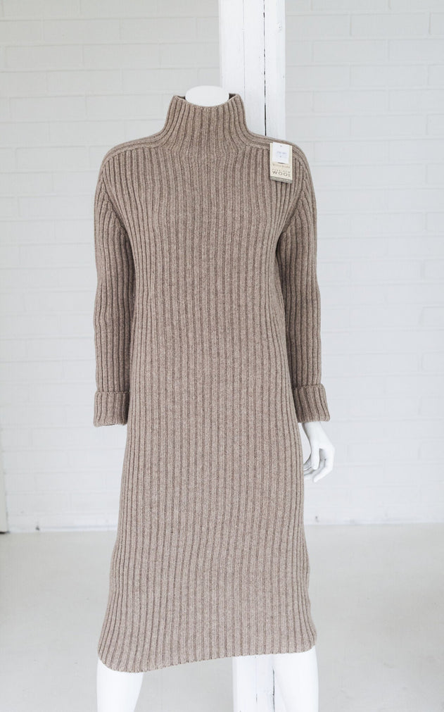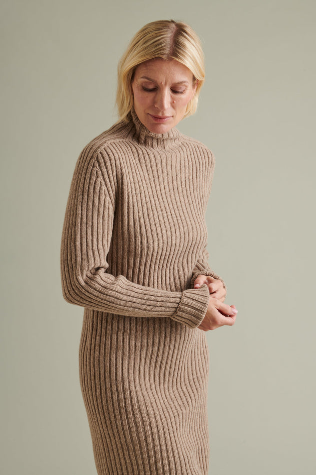 The Utö knit dress is a classic, long, and stylish wool dress made from soft 100% merino wool. It features a timeless and simple straight design. A beautiful detail is the shoulder line, which continues seamlessly from the sleeve to the neckline collar. There's a stand-up collar that can be folded inward to add a nice touch to the neckline. The long sleeve provides wonderful warmth and can be rolled up for added structure.