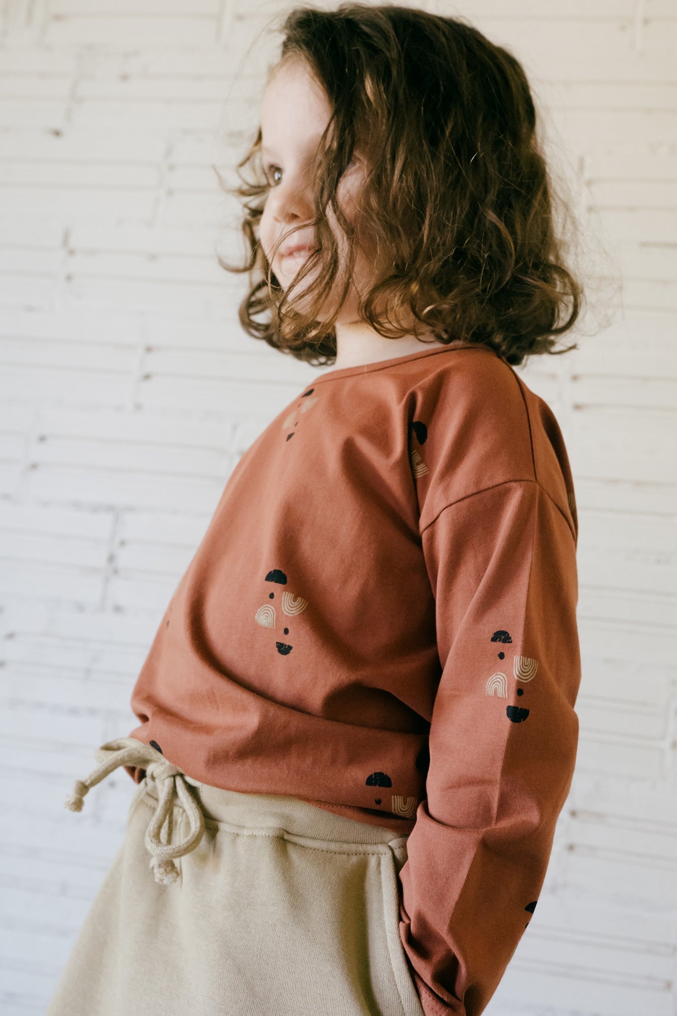 Kid's Gayle is an oversized t-shirt with drop shoulders and long sleeves. Tiralahilacha's sidereal rain print in beige.