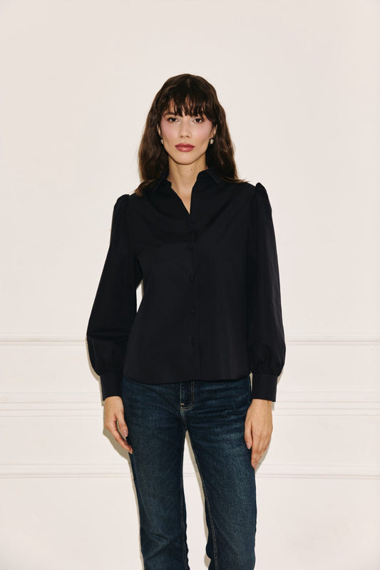 The Ophelia shirt black combines timeless elegance with modern design. Crafted from black cotton, it features distinctive puff sleeves and covered buttons that enhance its refined look. Its classic collar and slightly cropped length make it ideal for layering, whether draped loosely over tailored pants or a skirt for a sophisticated ensemble, or paired casually with jeans for everyday versatility. This shirt offers both style and comfort, making it a sophisticated staple in any wardrobe.