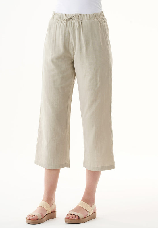 Women's culottes made of crinkle double-face fabric. With elastic waistband and drawstring, side pockets and an inner lining.