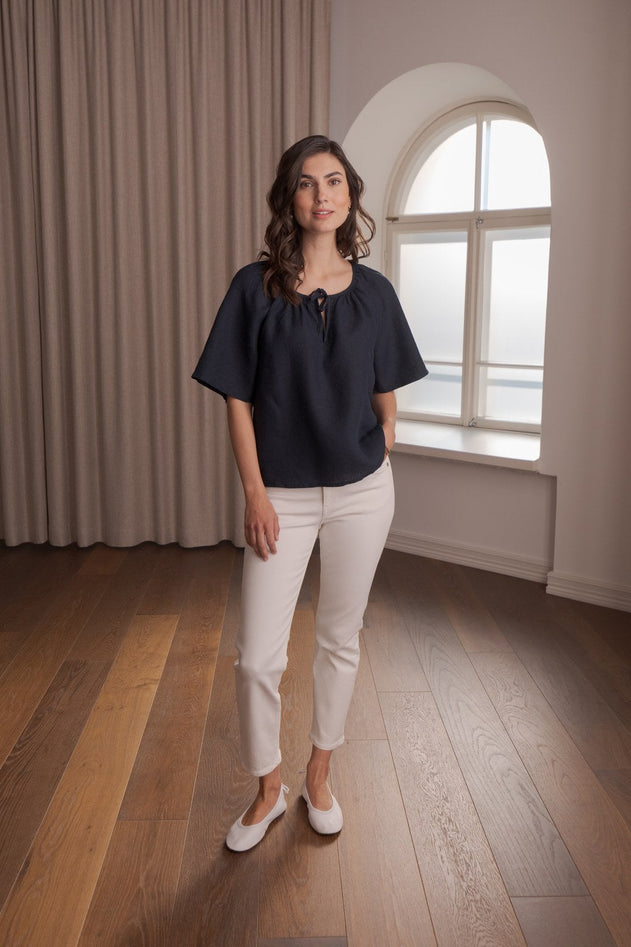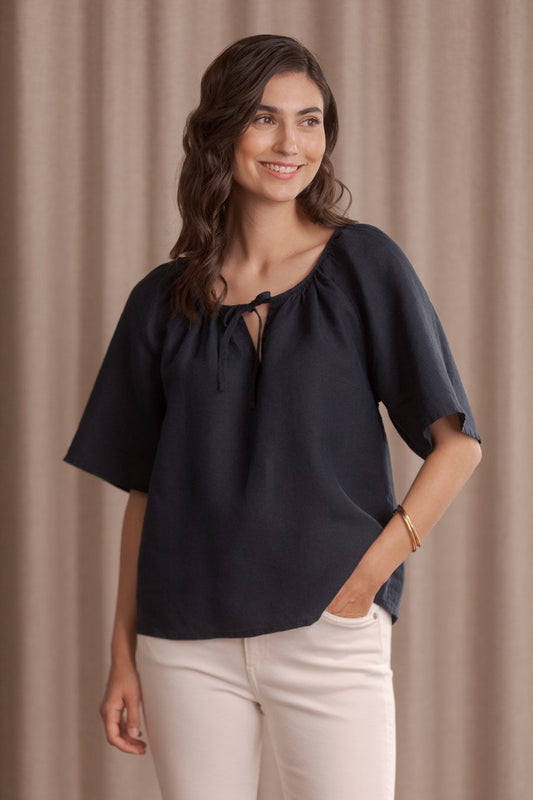 A casual short-sleeved linen top featuring slightly flared sleeves and a wide neckline accented with elegant decorative pleating. A subtle V-slit at the front is finished with delicate tie-up straps for added charm. Made from 100% European linen, it offers a breathable, skin-friendly feel perfect for warm days.