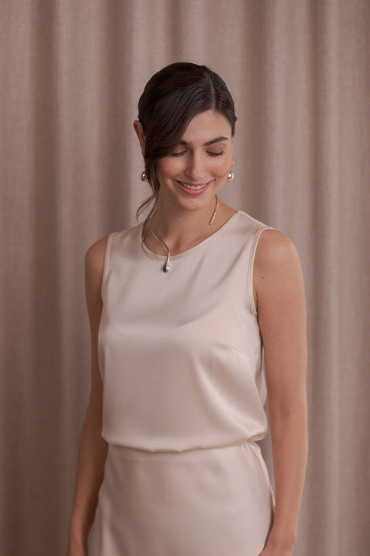 Short-sleeved silky satin top made from Japanese triacetate-modified fiber. The straight-cut shirt has a round neckline with a fabric-covered button at the back and stylish slits at the sides. The easy-care material does not wrinkle and feels comfortable to wear.