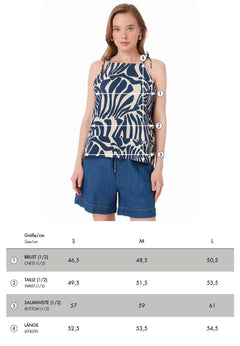 Sleeveless summer top with adjustable straps. The abstract all-over print is dyed with water-based colors.