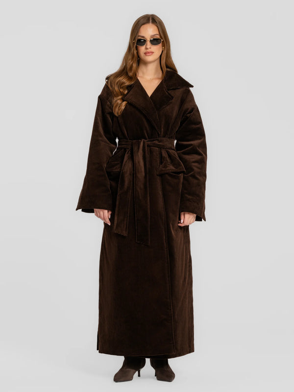 Long coat with oversize cut, made of soft 100% cotton corduroy. It is characterized by deep texture and pleasant to the touch finish. The loose fit with a wide collar and waist tie accentuates the silhouette while maintaining comfortable movement. The maxi length adds sophistication, making the model ideal for layering.