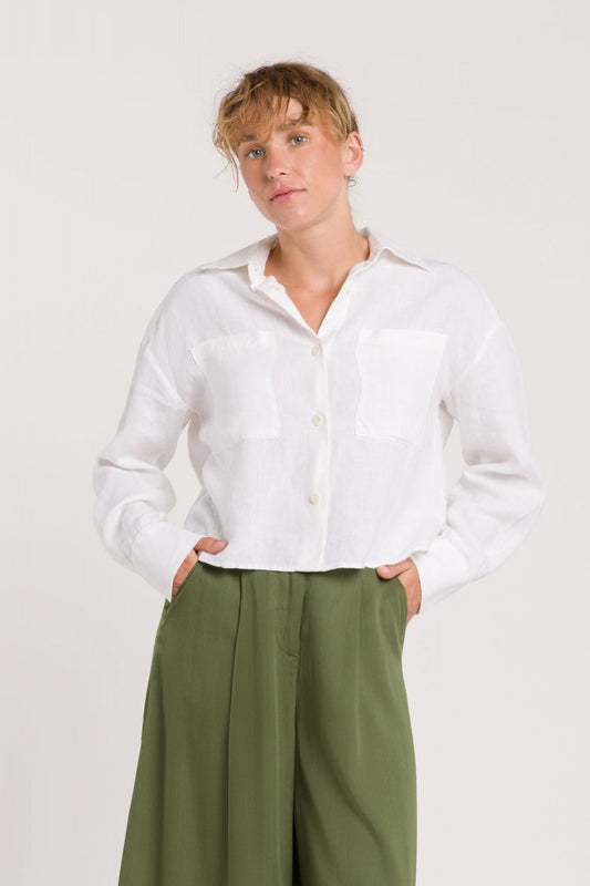 Regular fit button up blouse with pleated sleeves. Crafted from 100% linen. The slight cropped fit works well with high waist pants or jeans.