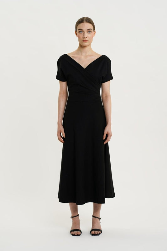 Anis is an A-line dress with a draped chest and a wide, flowing skirt that falls just below the calf. Made from a high-quality, heavy jersey fabric with stretch, this dress offers both comfort and style. Its simple yet elegant design makes it a versatile addition to any wardrobe, suitable for a variety of occasions.