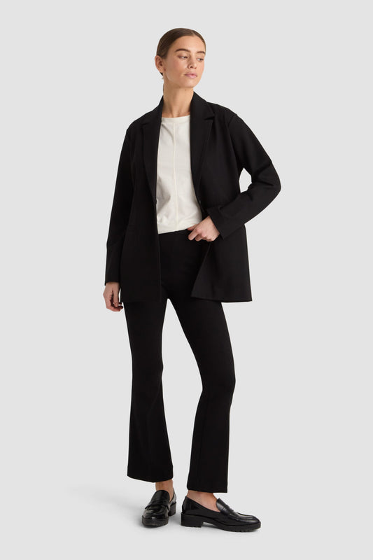 The Annie Blazer in black offers a timeless, structured silhouette with a single front button closure for a sleek finish. Its bold collar and two front welt pockets combine classic tailoring with a confident edge, making it an essential piece for a polished, professional wardrobe.