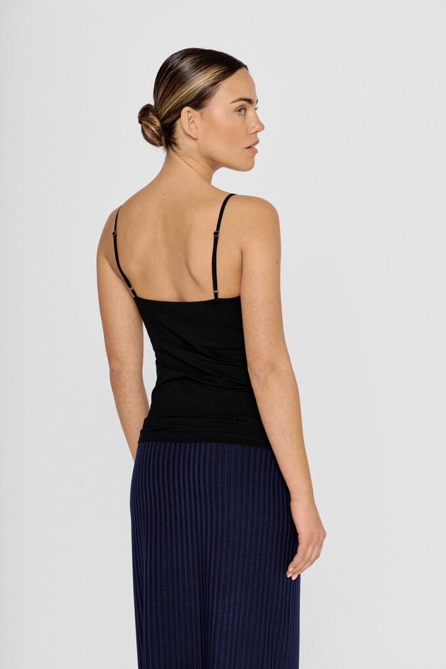 The Bebe Top by Residus is a fitted sleeveless top with adjustable spaghetti straps. The sweetheart neckline has a flattering gathering at the bust. Made with lightweight jersey stretch organic cotton blend.